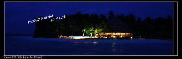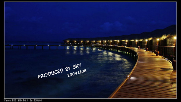 夜晚的日落Bar,长长的走廊另外一头就是岛上唯一的几间水屋