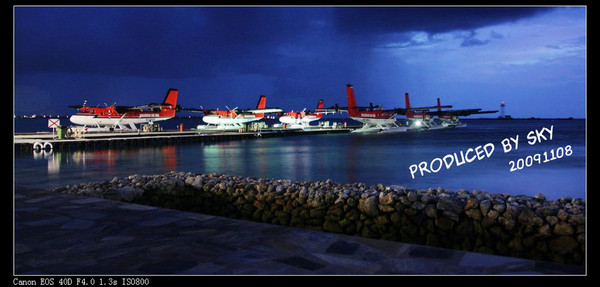 乘坐的斯航半夜到达斯里兰卡—转小飞机到达马代的机场岛,距离首都马累快艇20分钟,这时已经是当地时间夜里3点左右,经过在机场岛一夜的等待,于在上6点搭乘第一班水飞公司的小巴,开往水飞码头(水飞=水上飞机)。这时天空已经微微发亮,经过大概13个小时吐得昏天黑地的我,看见停靠在码头边一架架水飞和远方的灯塔,仿佛看见了希望的曙光