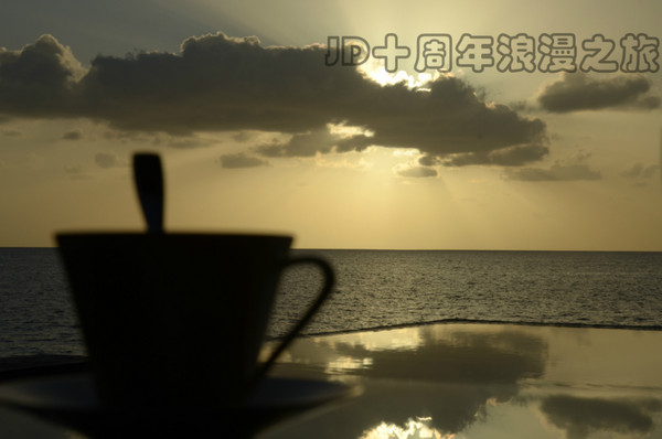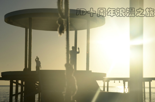 最后一天的早晨,我俩起的特别早。虽然还是很困,但为了迎接马尔代夫的最后一次日出,也是为了珍惜越来越少的幸福时光,就毅然在闹钟的帮助下放弃了懒觉(在麻袋睡懒觉实在是太奢侈了)。海上日出的美,是非常震撼的。虽说冉冉升起的太阳在镜头中显得不是特别的大,但当那一轮红日跳入眼帘的瞬间,还是美得让人心醉!