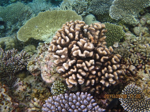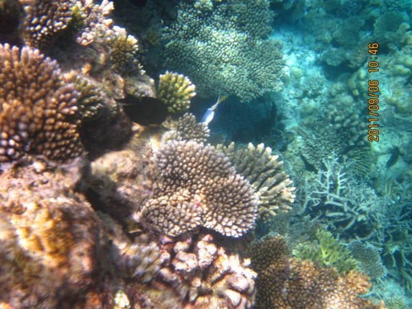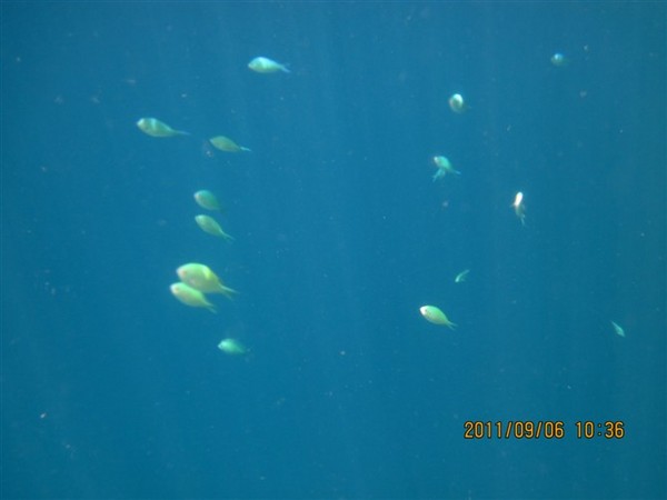 来之前我在网上租了一个佳能的水下相机,对方寄来时相机外面套了一个透明的塑料袋子,我以为那是专门防水用的,不能拿下来。再加上第一次浮潜,水下拍摄经验不足,手未能克服海水的波动,所以拍出的照片大多是一片波光粼粼。后来看到同船的人也有拿着同款相机的,但人家根本就没套塑料袋,我才知道,自己傻了。