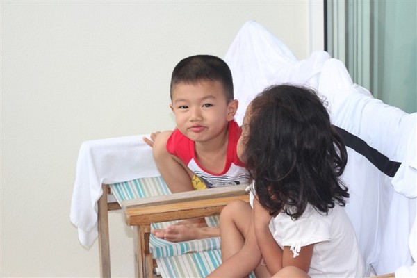 转头看见不远处走来一家三口,那趴在老爸背上的不是昨天跟璇璇一起玩的淘淘吗?见了面,淘淘的妈妈赶紧给我讲淘淘早上一起床就嚷着要找璇璇玩,还说昨天他们一家参加无人岛野餐活动回来,问淘淘好不好玩,淘淘说,不好玩,跟璇璇姐姐最好玩,哈哈。我邀请淘淘一起上去叫醒璇璇,他欣然应允。