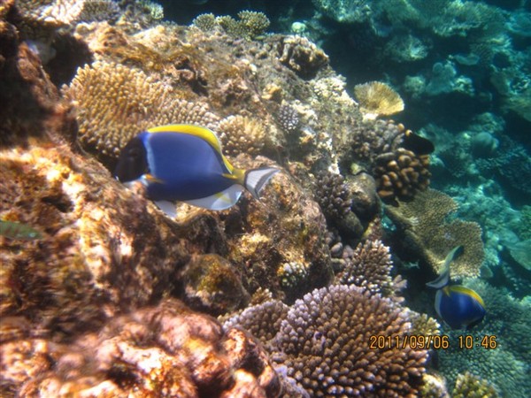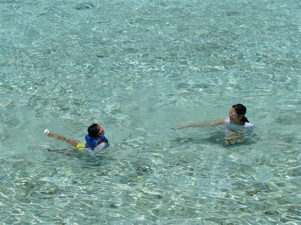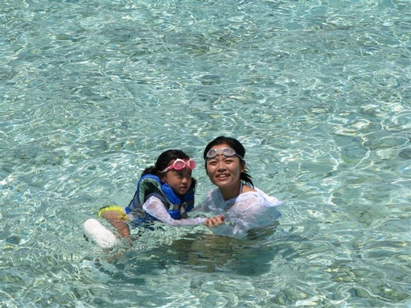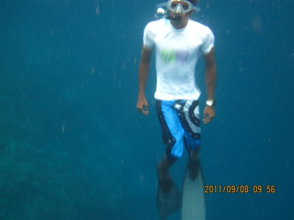 浮潜培训的教练是费,培训的内容就是我们穿了鸭蹼、带了潜水镜和呼吸管(这些工具都可免费借用),在游泳池里学习怎样安全地前进、后退、呼吸。培训后教练又让大家到靠近岸边的海水里练习了一下,我老是不习惯只用嘴呼吸,呛了好几口海水。