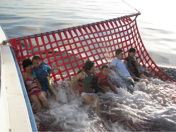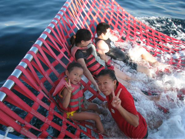 快艇渐渐远离了康杜玛岛,海水开始从浅蓝慢慢变成了深蓝,但还是清能见底。远处的海面上不时能看到一块块像碧绿的宝石一样的区域,那是海水比较浅的礁石区,我们一路被这奇异的大海吸引着,只觉得两只眼睛不够用。也不知到了哪里,快艇渐渐慢了下来,船的两边各伸出一根金属杆子,杆子上挂着一个红色的大网,这就是我们今天的网上漂流活动了。费先给我们做了示范,一边示范一边详细讲解,总结下来就是要手脚并用地把网抓牢,不让自己掉下去。示范结束后,胆大的男生迫不及待地爬了下去,接着是两个小孩,费双脚站在网上,接应我们。