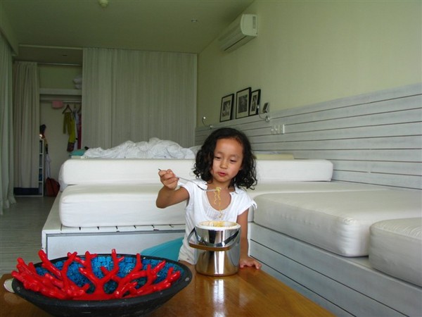 在儿童中心玩到了中午,孩子们都渐渐散了,璇璇还舍不得走,我引诱她:我们回去泡方便面吃,她一听,立刻乖乖地跟着我回去了。我们的午餐:方便面。因为攻略里说,康杜玛的正餐都比较贵,所以我带了很多方便面,决定只有每天晚餐去餐厅吃,午餐就吃方便面。璇璇对方便面的热情可比正餐高多了,可能因为在家里时一般都不让她吃方便面。
