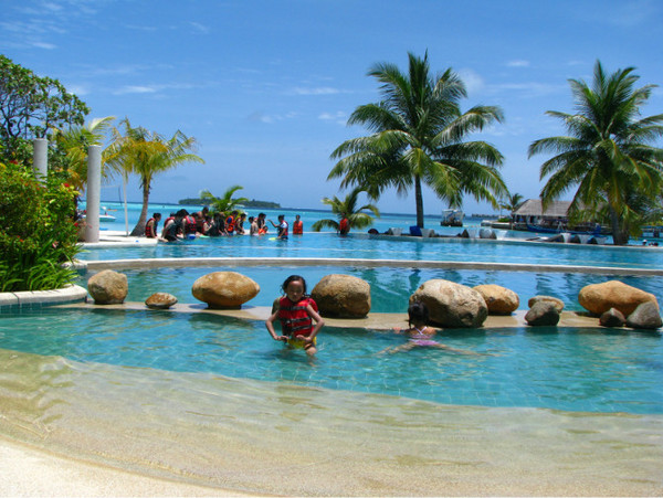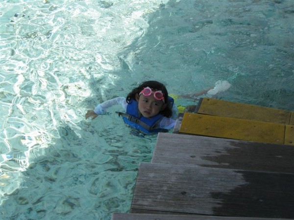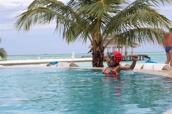 今天已经是住水上屋的第二天了,今天下午1点前要收拾东西从水上屋换到双层沙滩别墅去。我心里还想着去水上屋前的海里游泳,但璇迷上了这个游泳池,死活不肯回去,我也没办法,只好陪着她在游泳池里玩。