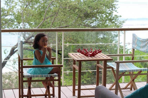 眼睛实在不想离开这迷人的风景,但肚子已经开始咕咕叫了,我只好收拾心情,把璇璇叫起来洗漱、换泳衣,再吃点饼干先填填肚子。康杜玛的早餐是自助餐,是含在了住宿费里的,供应的时间比较长,所以我们也不急着去吃。吃了饼干后就沿着房间外面的木板路来到了阳台下的露台上。璇璇今天的兴致很高,主动摆着POSE让我拍照,阳光、蓝天、大海、俏皮的美女,这照片想不漂亮都不行啊。