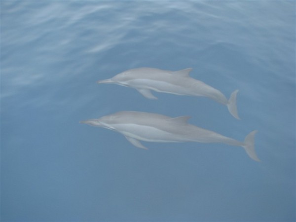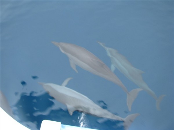 第二次出海浮潜,我们的运气很好。快艇离开海岛不久就听到外面有船员在欢呼。大家循声看去,在船头前方不远处,出现了几群跳跃的身影,原来是海豚!而且不是一群,是三群!它们在海面上跳跃出优美的弧线,一个又一个,乐此不疲。船渐渐开近了,它们也不害怕,在船头相互追逐着,灰白色光滑的皮肤那么清晰,全船的人都争先恐后地拍照。同行的福建朋友兴奋地说,昨天他们专门报名参加出海看海豚的活动,结果只远距离看到了一眼,今天可真是买一送一啊。过一会,听见他大叫:“老婆,我用DV在拍……啊,啊,DV没电了!!”逗得我们哈哈大笑。
