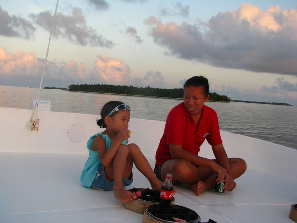 在水里泡够了,我们陆续都上了船,船员用船上的淡水给我们冲洗了一下。小孩子换上干衣服,大人就用带来的蓝色大浴巾裹上。快艇慢慢掉头,往着落日的方向开去。费打开冷藏箱,拿出给我们准备的冰冻饮料、小点心,我们一起坐在快艇的二楼平台,喝饮料、品点心、赏落日、聊天,此情此景,原谅我无法用我有限的词语来表达……