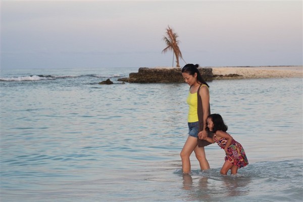屋下的海水不深,才及我的腰,但璇璇踩不到底,她也不会在水下憋气,于是我牵着她,她在水面上看,我就从水里看,波光粼粼的海水里,不时有漂亮的鱼儿游过,还能看见一些浅色的珊瑚。我们就这样在水里游来荡去,偶尔仰躺在海水上,看着这蓝天碧海,满意地长叹一口气。