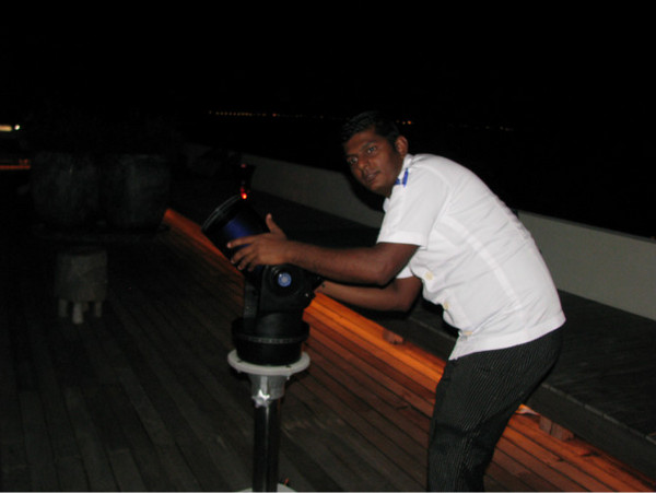 玩了一会,waiter们说楼顶上有天文望远镜,可以看月亮,于是我们一起来到楼顶。餐厅的楼顶上是类似于露天酒吧的地方,视线很开阔,布置得也很浪漫,很适合情侣躺在这里看星星。Waiter把天文望远镜调好,透过望远镜,我真的看到了灰白色的月球,和它那坑坑洼洼的表面!