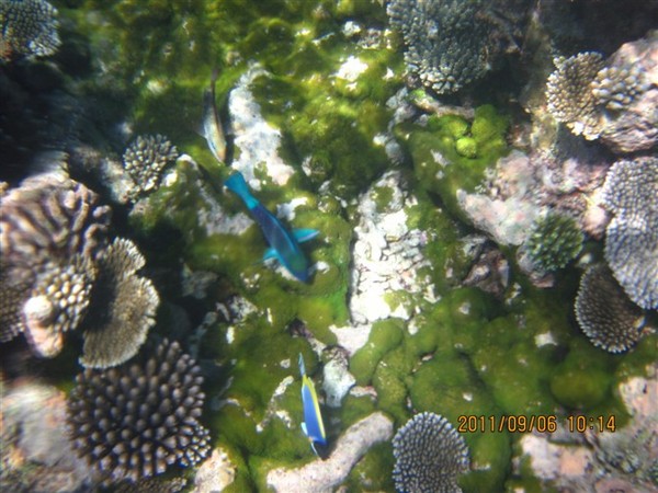 下午,已经天晴了,估计是因为涨潮的缘故,屋下的海水涨起来了,但还是清能见底。于是吃过午饭,我们就穿上了房间里的救生衣,配戴了行头,从露台旁的梯子下到了海里,开始第一次与海水的亲密接触。