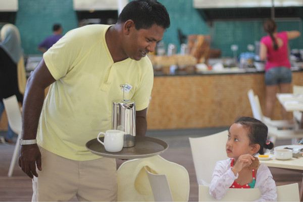 由于每天早餐都在同一个餐厅,餐厅的waiter们都跟我们很熟了,经常走过来打个招呼,逗逗璇。