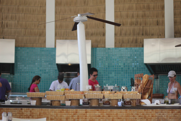 如果不是肚子一直抗议,我们真想就在这房间里呆上一整天。终于还是全身涂满防晒霜、穿上防晒衣、带上墨镜、帽子,依依不舍地出门觅食了。吃自助餐的地方在房间的明信片上标注得有,我们沿着沙滩路一直往右边走就行了。感觉走了很久(主要是因为很饿了),终于看到了椰子壳顶的接待中心,自助餐厅就在接待中心的旁边。餐厅外面是沙滩,出门左手边是一个圆形的游泳池,十米开外就是大海。我们选了一个最靠近游泳池的桌子放下东西,带着璇璇去餐点前流连了。早餐的品种很丰盛,有各种新鲜果汁、新鲜水果、品种繁多的面包、蛋糕,肉类、蛋类。。。。。还有很多叫不出名字的东西。