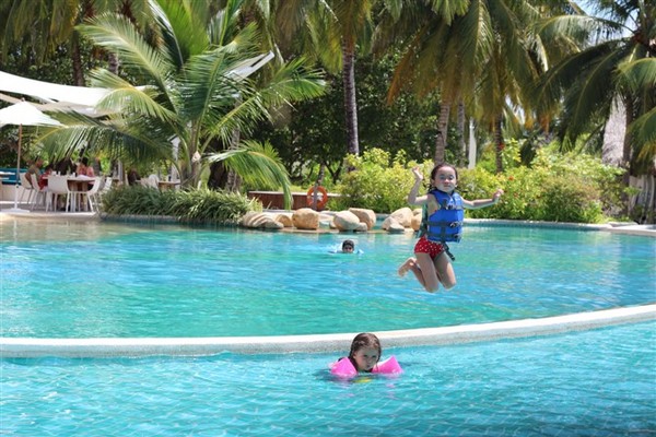 第二天,照例是在餐厅吃了自助早餐,今天没有再下雨,天气很好,吃过早饭,璇终于可以冲进她向往已久的游泳池了。游泳池很漂亮,由浅到深,很适合小孩子玩,里面还有一个可以坐着享受水流冲击按摩的小池子。