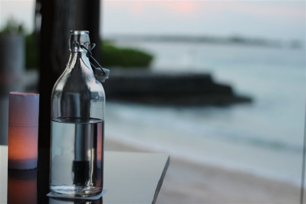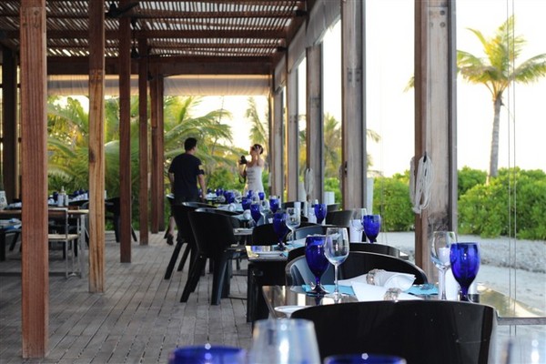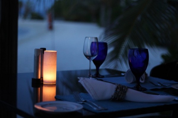 餐厅在一楼,靠海的一边是开放式的,坐在餐厅里可以看见无敌海景。黑色的桌椅、深蓝色的杯具,白色的餐巾,这一切,都让人觉得是那么地浪漫。当夜幕降临,waiter会给每个桌子点上蜡烛,烛光摇曳,吹着海风、看着面前的沙滩、海浪,听着餐厅里缓缓流动的音乐,我觉得我快要醉了。