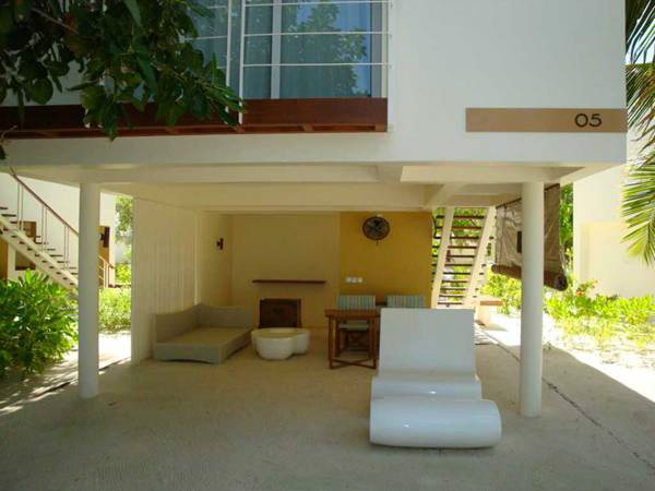 新的房间在离餐厅不远的海边,是双层的别墅,下面一层是架空的,有沙发和躺椅,还有淋浴设施,但一般都用来冲洗脚上的沙子。沿着木质的楼梯上去,二楼是客人住的房间。房间设施的颜色跟水上屋统一,都是孔雀蓝和白色相间,只是没有露台和浴缸。其实这里也很好,只是比水上屋差一点。璇璇坐在阳台上吃着房间里提供的橙子,已经忘了刚才的不开心了