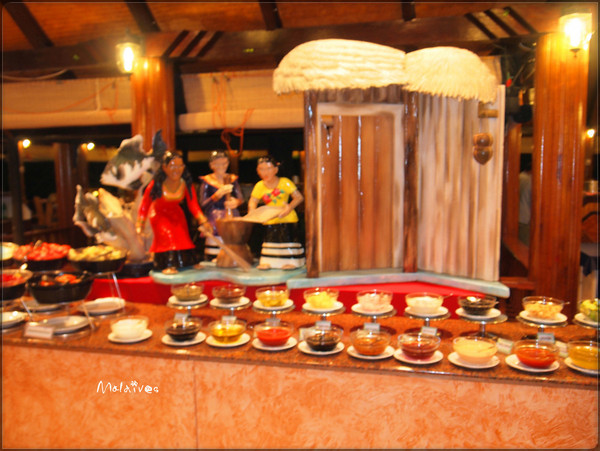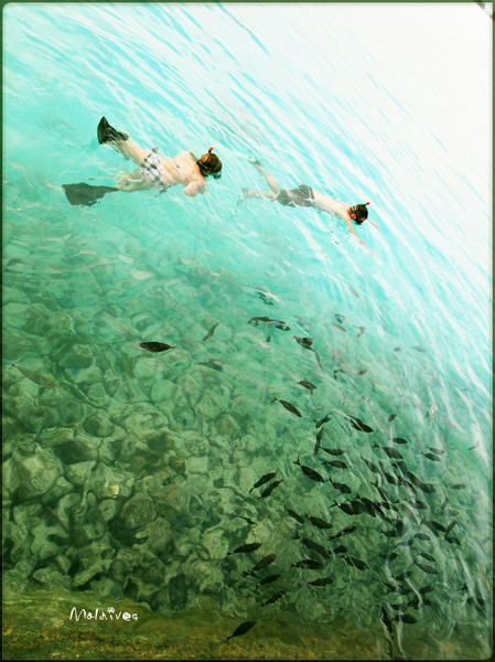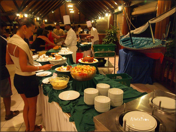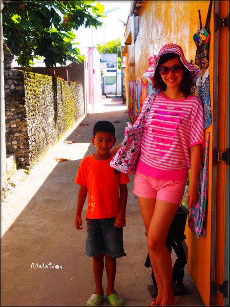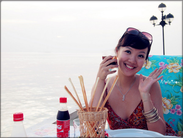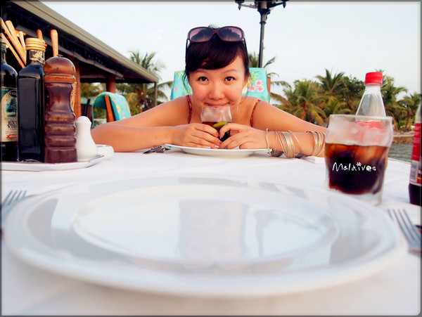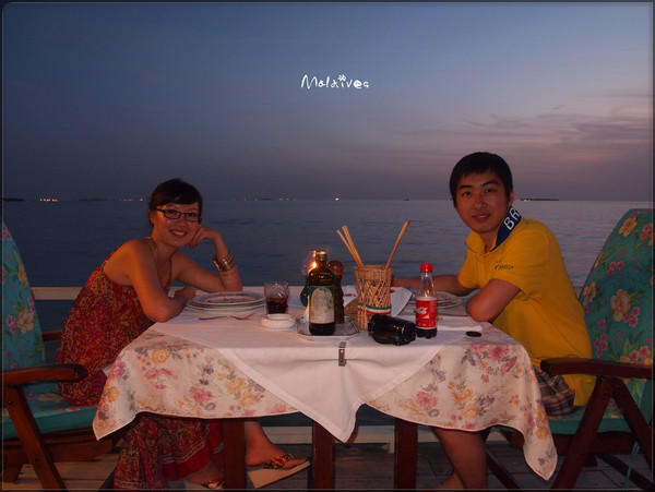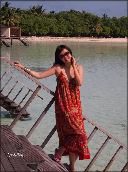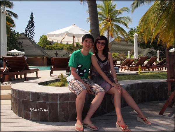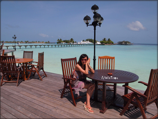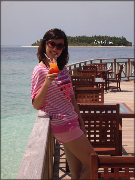 第二站是参观一个度假村,这里貌似没有什么居民,只有一个酒吧,我们那对深圳的夫妇一起坐下来要了几杯鸡尾酒。由于年龄相仿,聊了几句就熟识了,原来他们是在银行工作,和老公同行。其实来马尔代夫度假的中国人挺多的,尤其是天堂岛、圆月岛、卡尼岛这些名气较大的岛,基本上一半都是中国人。很多新婚夫妇都会选择来这里度蜜月。我和老公这就算是再度蜜月吧。呵呵。