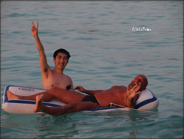 水屋的楼梯直通大海,海水被晒了一个上午,特别温暖,泡在里面,突然一种幸福感油然而生。顺便偷看了一下旁边的外国妞,身材好正啊。她也看到了我,很友好的和我打招呼,一点儿也没有不自在。看来是我多虑了。