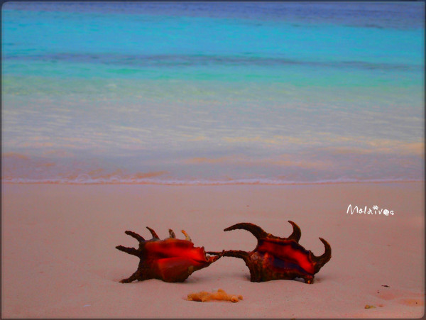 1个小时的浮潜后,开始饥肠辘辘了。正好,小黑们已经准备好了午餐,有各式各样的沙拉、茄汁意大利面,还有现烤的鸡排和香肠。味道还是蛮不错滴。午饭过后,老外们又下都下去潜水了,我们四个中国人就躲在树荫下吹海风。海边有小黑在玩水上摩托,十分刺激,我反倒觉得觉得这里应该禁止这项水上活动,这么干净的海水,污染了多可惜啊。休息了一会,老公忍不住又去潜水了。我继续在海边欣赏迷人的风景和过往的俊男靓女,好不惬意。过了一会,老公上岸了,带回了两个好大的海螺。这小子,每次都是在不经意间带给我惊喜。上次在迪拜海边也是捡回来好多贝壳。呵呵。可惜马尔代夫的珊瑚和海螺都是不让带回国的,抓到了会处以巨额罚款,我们只能拍照留念了。