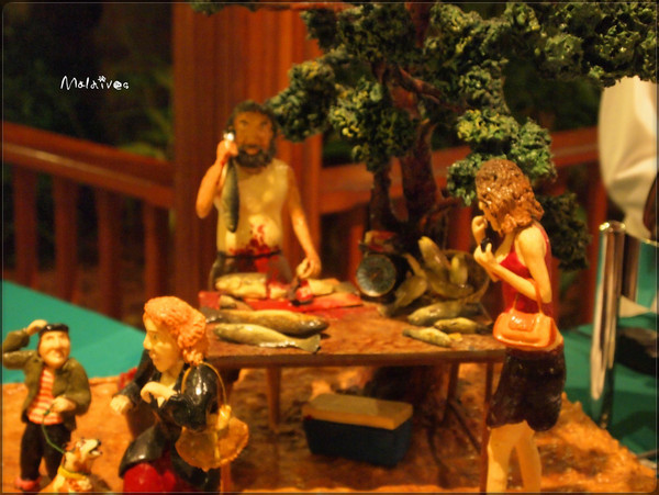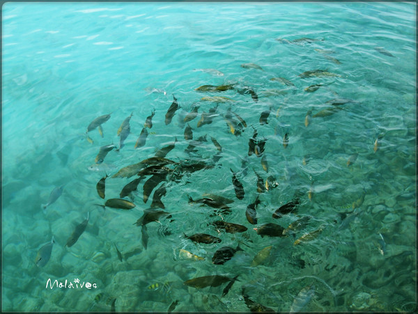 中午12点准时退房,由于是凌晨的飞机,晚上才有快艇送我们去机场,我拉着老公在天堂岛上四处转悠,寻找那些被遗漏的美景。早上从餐厅里“打包”了一些面包,正好到栈道上喂鱼。马尔代夫的水特别清澈,五彩斑斓的鱼在里面游来游去。丢一块面包,立刻引来一大群鱼争夺。夺到的,扭头就跑,剩下的就在后面穷追不舍。从栈道的开头边走边喂食,一大群鱼就这样一直跟着你,从岸边一直游到码头。