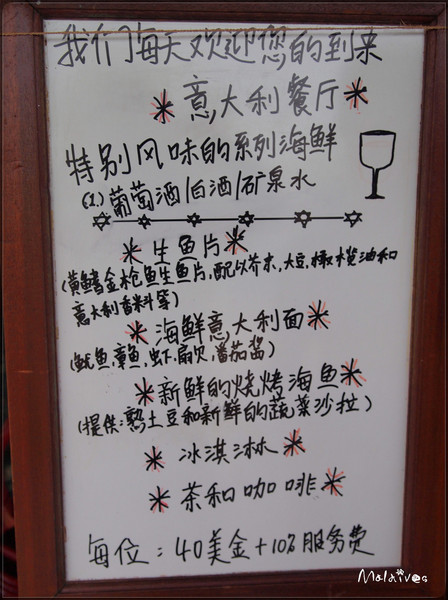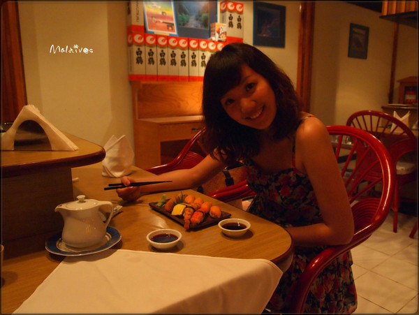 转了好大一圈,肚子饿的咕噜咕噜叫了,今晚决定去岛上的日本餐厅尝尝鲜。要了一个刺身拼盘,一个海鲜面,一个牛排,一共66刀。老公说我是三文鱼控,来到马尔代夫也不忘吃三文鱼寿司。O(∩_∩)O哈哈~