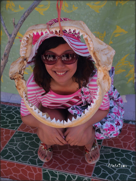 看完海豚表演,我们来到了当地的原住民的小岛,小黑在这里开店兜售工艺品。我们一进岛,就被热情的小黑围上了,和我们说“看看”“便宜”中文发音甚为标准,可见这里曾经接待过许多的中国游客。转了一大圈,认为岛上最有特色的商品就是这个鲨鱼嘴了。小黑开价50刀,一来囊中羞涩,二来怕带不回广州,就只能欣赏一下啦。