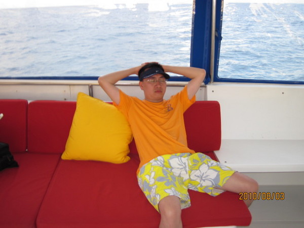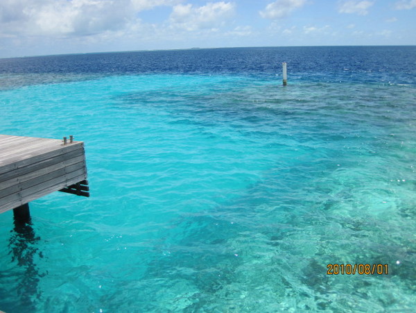 深蓝和浅蓝交界的地方,就是岛的外围,在那里就能看见很漂亮的珊瑚和鱼,不过对于游泳技术不好的我们,还是有点怕被珊瑚刮到,放弃了,因为我和老公都已经负伤了