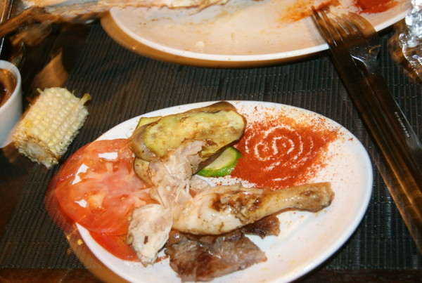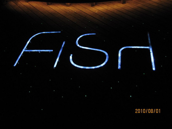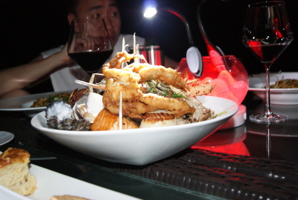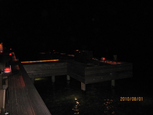 钓回来的鱼,小黑都会统计你打算怎么吃,如果当天晚上要吃的话,可以送去FIRE跟FISH加工,FIRE好像不收加工费,那里本来就是烧烤自助,75美金一个人,还要加服务费,已经收的够贵了。如果去FISH吃的话也是要加收一房50美金的服务费。跟送到房间BBQ一样的,所以我们就选了自己BBQ,不过就是当晚吃不到,因为在房间BBQ要提前四个小时预订才行,我们只好第二天晚上吃了。 我们在FIRE吃饭,灯光很暗,照的照片都是花的,好像这里到了晚上都是这样,到处灯光都很暗,是觉得这样有情调吗??!!FIRE的这顿饭算是最合口味的一顿了,有烤全羊,烤鸡,烤鱼,烤牛肉,非常丰富,还是比较对得起他的价格,我们一阵胡吃海塞的,但还是眼大肚皮小,拿的都没吃完。这里的自助餐跟国内不一样,拿的东西吃一会没吃完,就会有人收走,好浪费啊!!