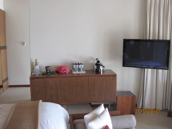 到了房间好久了,都已经把房间逛了个遍了,我们的行李还没送到。唉!!马上感觉到差别了。好不容易等来了,居然那个小黑就准备把行李摆在门口!!!后来我要求他搬进来,他才给我搬到衣柜边上,根本就没有要帮我摆到衣柜里面的意思。我已经没有语言了,同样号称奢华酒店,服务就差那么多吗?好像这边的房间没比四季的便宜什么嘛!后来还是我和老公自己把箱子搬到衣柜里放着的,刚刚才到,很影响心情!!哎呀!酒店的空调也不凉爽,气死人了,卧室和卫生间是连通的,那么大一个房间,就一个出风口,温度我都调到最低16度了,制冷效果还是不好,不晓得是空调威力不够还是房顶隔热效果不好。