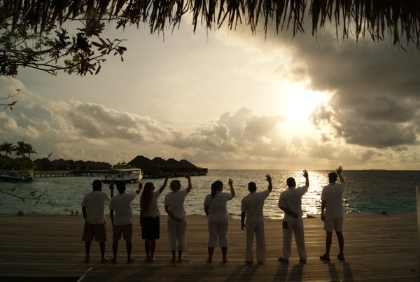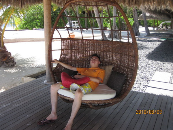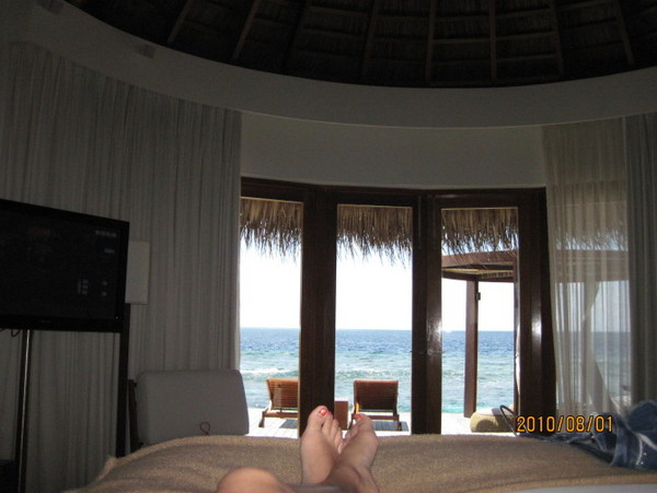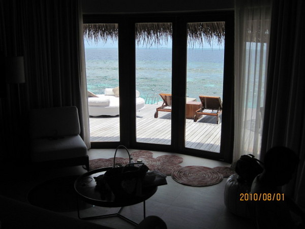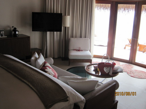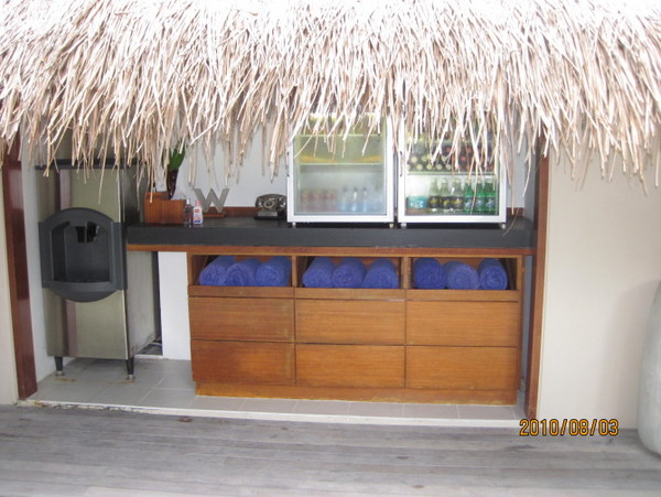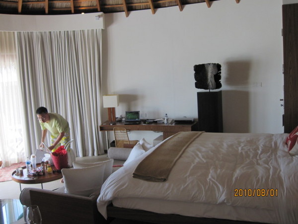 订完了活动,打算回房间休息一下,然后下水浮浅,这样的作息时间是在四季就习惯了的。可是回到房间,烦心事又来了。居然小黑还没有来打算房间,算了,打电话去催一下,让酒店安排人来做卫生。来做卫生了,我们只好去隔壁何老师房间呆会了。打扫完了,回到房间,除了从床上看得出来打扫过,桌子上乱七八糟的东西依然摆在那里,露台上的躺椅也没有铺上浴巾,这里完全需要自己动手,还要自己去水吧哪里拿浴巾!!在四季是每天早上会给你铺上,不管你用不用,到了晚上会有人来收。到了W还需要烦心服务的问题,什么事情还要你打电话去说,前几天放松的好心情一下全没了。你说第一天他们不知道我们的作息时间吧!!结果我们在岛上一共4天,每天都是需要你打电话叫他们来做卫生!!!!朋友开玩笑的说,W是美国的酒店集团管理的,所以很奔放,不注重细节。真不知道是在讽刺还是在帮它说好话。很难想像号称如此高级别的酒店,服务居然做成这样!!!反正这次选择W很失误!!至少不该安排在去过了四季之后!!