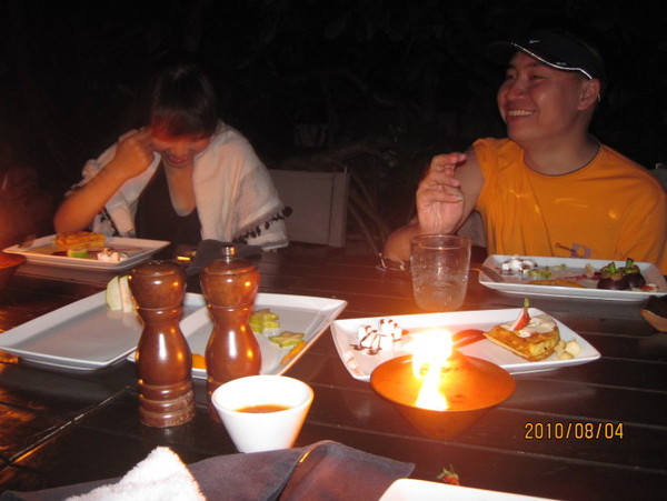 我们在岛上最后一晚的晚餐!自己在房间的露台上BBQ,小黑在预约的时间会来布置餐桌,生好炉子,把准备好的菜送来,今晚就我当大厨了,呵呵!!