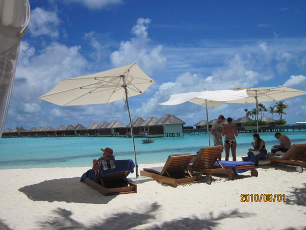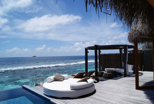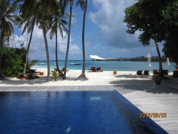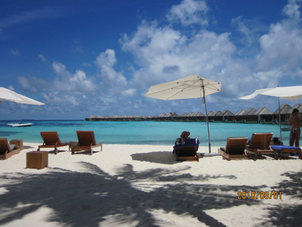 游泳池前面就是酒店的主沙滩了,W岛因为比大四季岛更靠近赤道,所以这边的天气要好一些,每天都是阳光明媚的,照得海水碧蓝碧蓝的。不过太阳也更晒一些,气候相比四季那边要火辣一些,四季那边晚上还有点点闷的感觉,W的气候早晚还有点凉。好奇特,真是每个岛有每个岛的特色。