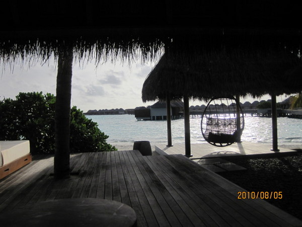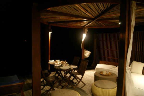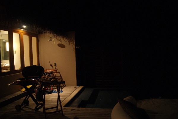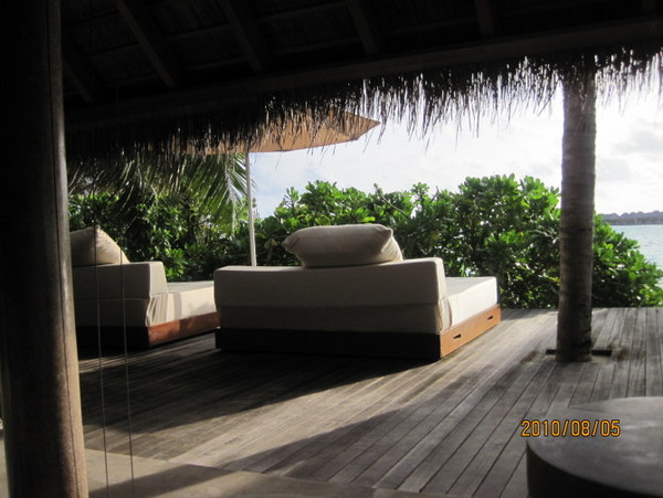 很大的露台,东西满丰富。来之前选酒店的时候,看到这个大露台是让我心动的主要原因之一。来了才知道,那么多东西,其实都只能做摆设,用处不大。说白了都是 躺着晒太阳的,躺在沙滩椅上跟躺在沙发床上晒有很大区别吗?那边的沙发,顶上不遮荫,白天根本不敢坐,晚上凤又太大,而且看着大海黑漆漆的,有点吓人。还是更喜欢四季岛的那个观海阁楼