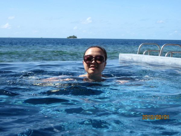 和老公正耍得高兴呢,郁闷的事情又来了。突然听见宏仔很何老师在叫我们,定神一听,他们在隔壁房间的露台上跟我们说话呢!他们问我们在干什么,怎么那么大的声音,我们才发现由于两个露台隔得太近,恐怕只有2,3米,我们这边泳池开冲浪的声音他们都听得见。天啊!!!太没有私密感了,我们还好是朋友,这样到好了,后面几天我们下海游泳,直接就在露台上喊就行了,不用像在四季还要打电话那么麻烦了。无语中。。。。。。