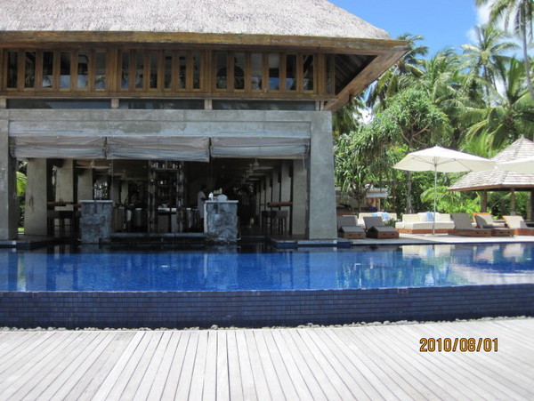 酒店的游泳池,比四季的小,而且就这么一个,四季酒店一共有3个公用的游泳池,都很大。泳池旁边的房子里是个酒吧,下午也可以喝下午茶,也是游泳池的水吧,楼上是阅览室、健身房、台球室,阅览室里有两台电脑,是苹果的一体机还比较爽,电脑比四季酒店的好。反正这里很多地方功能都是混合的,主要是岛太小了,没办法