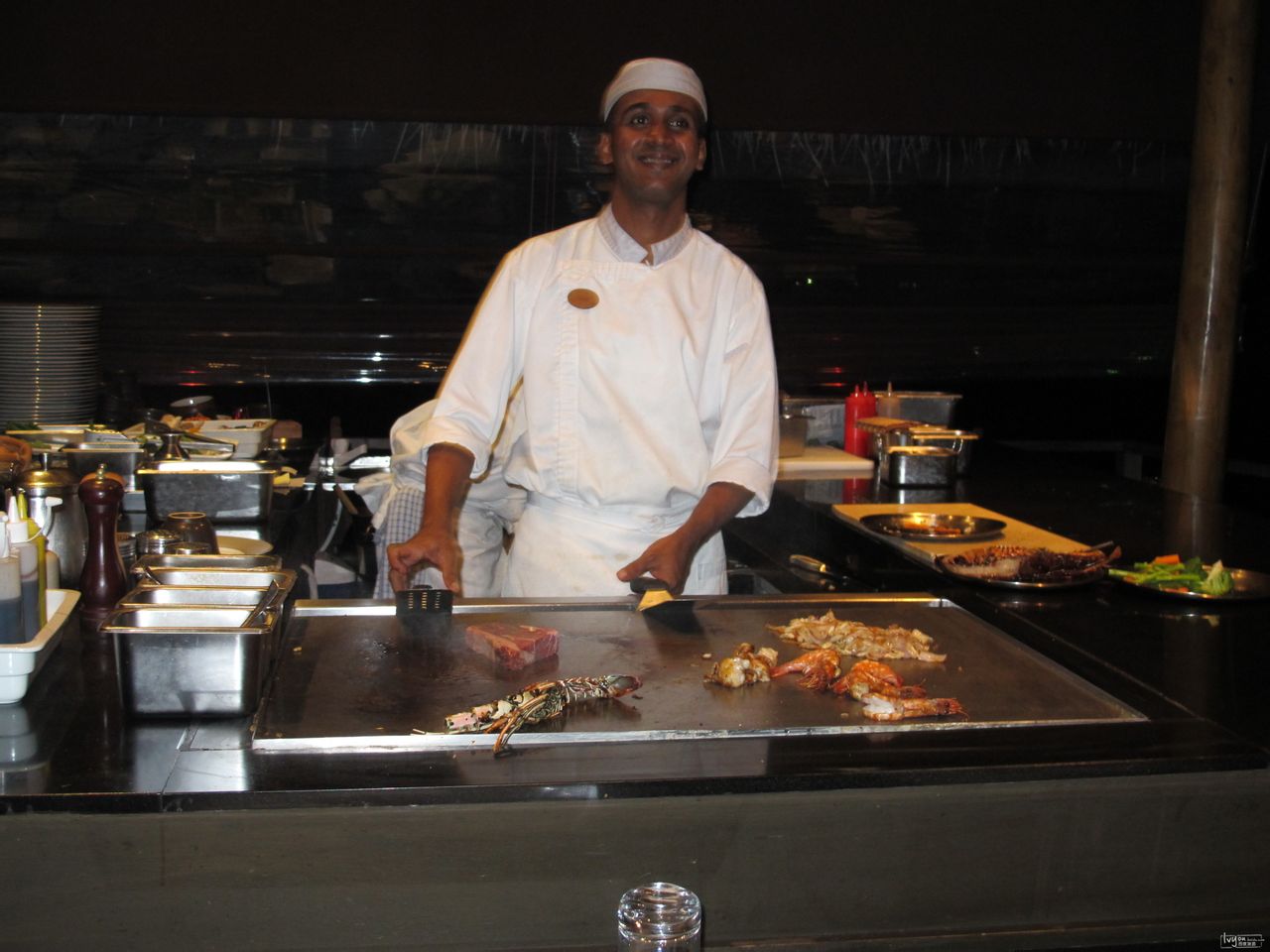 花式铁板师傅,斯里兰卡人。据说曾在科伦坡的希尔顿工作了一段时间。那晚,谈到高兴时,表演起花式烧烤,有节奏地敲击声,迎来一片掌声。被鼓舞的兰卡人于是又上演了高难度的转身飞铲,在前两次成功地完成后,终于在第三次抛向空中时失手,呵呵,换来全场友善的笑声