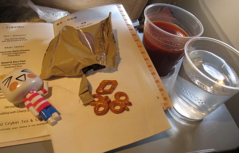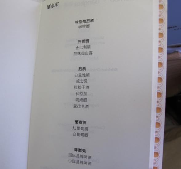 哈哈,很快就会发餐前小食品了,不是我说的,光好看不好吃。酒水车上的酒挺多,啤酒、红酒有好多种,果汁是汇源的,话说我看好多人点西红柿汁还以为会好喝呢,结果啊,真是原汁原味,不甜,咸。