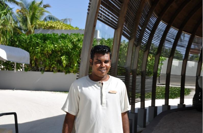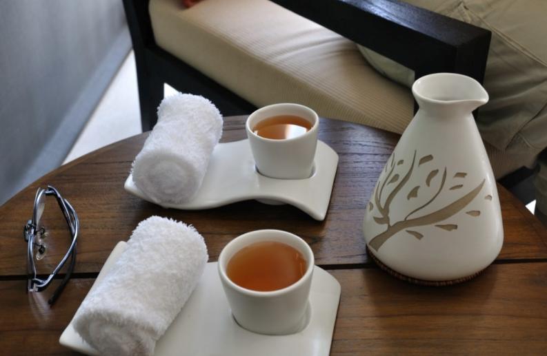 坐电瓶车到达房间。小黑在进屋之前都会脱鞋,但是客人不用。房间里面送上的热带水果汁和小点心