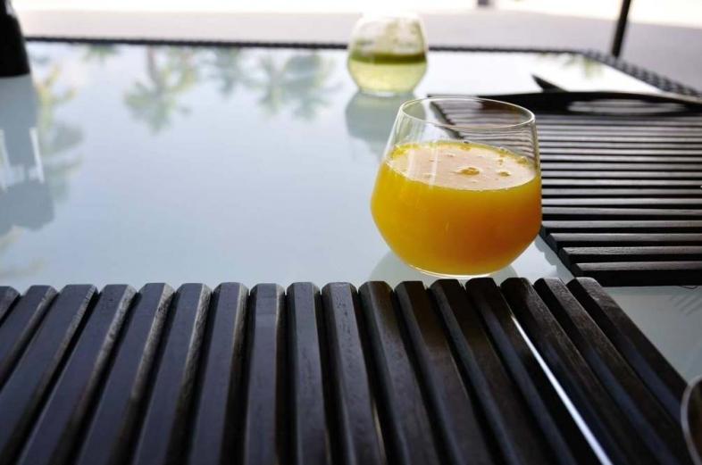 早餐一上来就会送上一杯鲜榨果汁。橙汁、绿苹果、红苹果、菠萝、西瓜。苹果汁一定要快点喝,不然就氧化变色了。