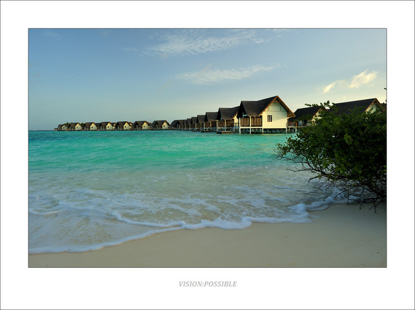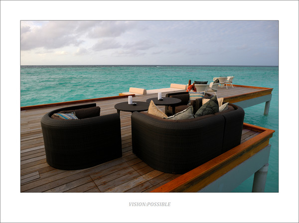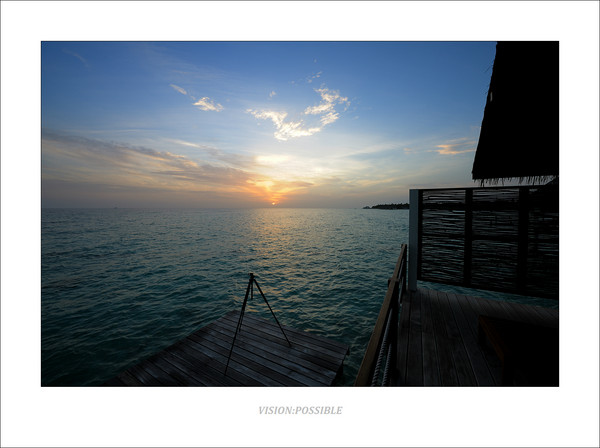 日出,这个水上屋也很大,感觉面积比库达呼拉那个还大,日出房。洗手间的马桶前面是一块钢化玻璃,坐在马桶上可以看到海水。