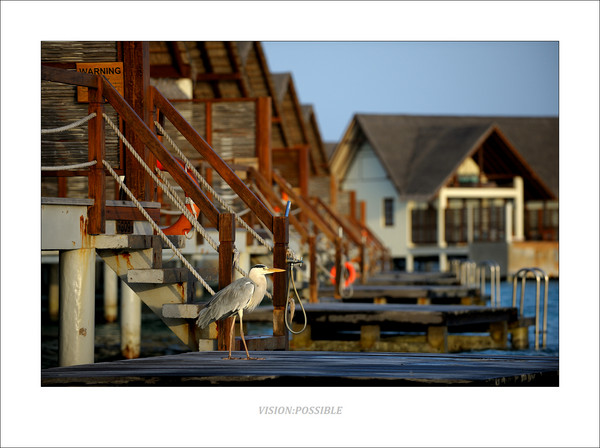 清晨,一只水禽(大概是夜鹭)停在隔壁的下水平台上。