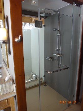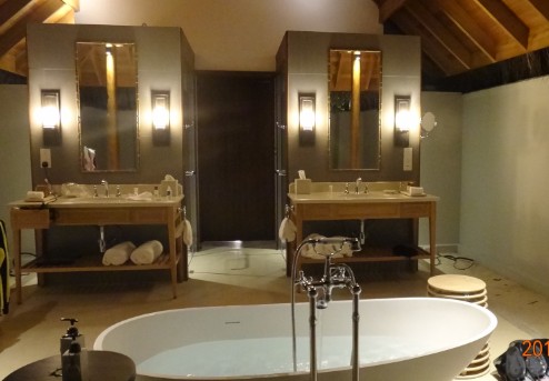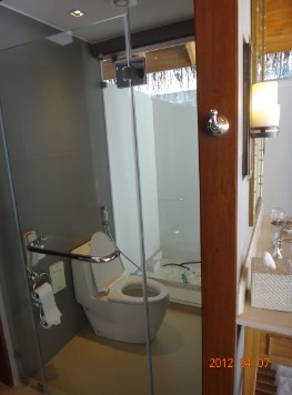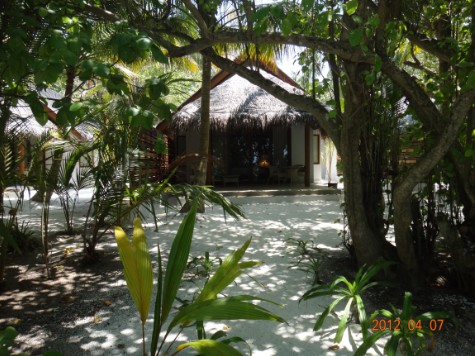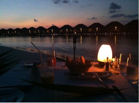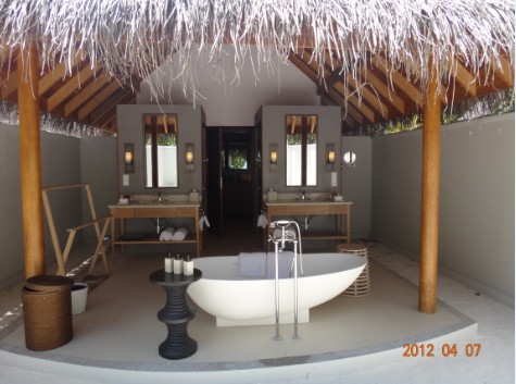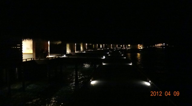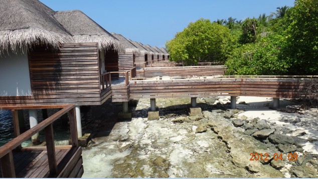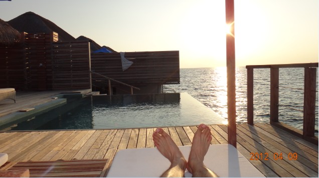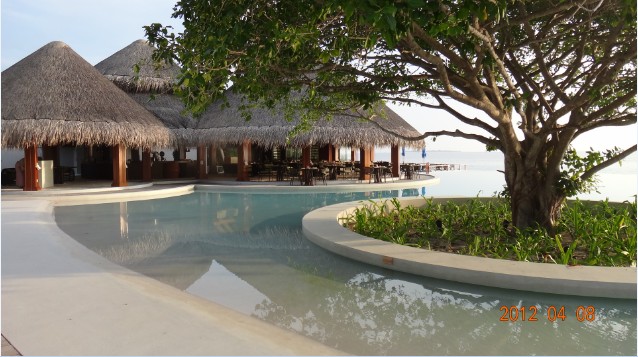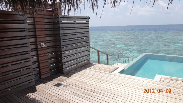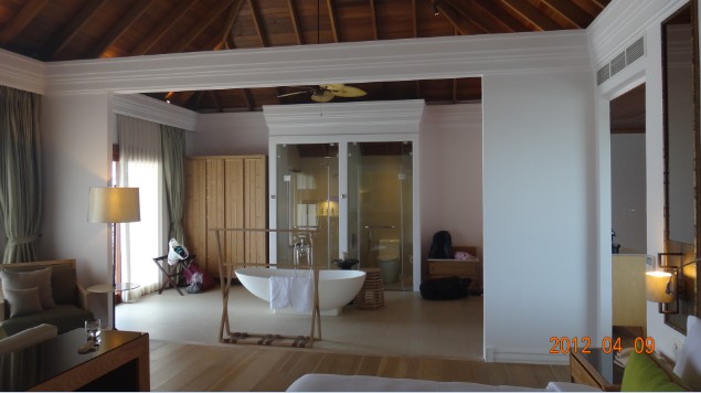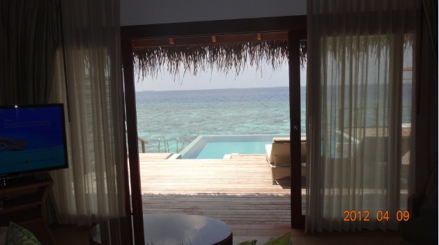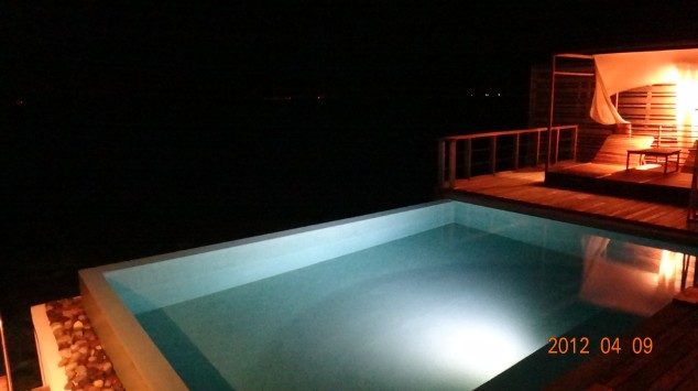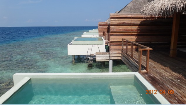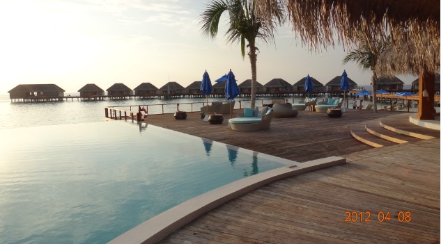 看到无边泳池的边了吗?对面是整排的水屋,最左边稍大的是他们的超级水屋,据说早被订满,一家欧洲人直接一住就是半个月,真是有钱啊!不过他们家2个大人3个小孩怎么住呢?那里的厕所和浴室可都是安的透明的门啊。。。。。。