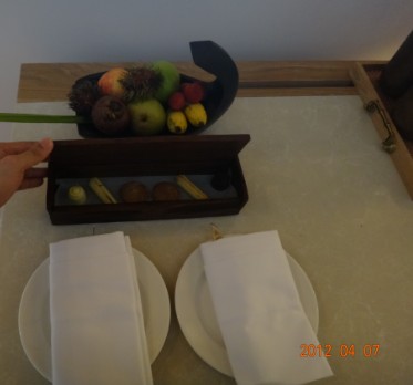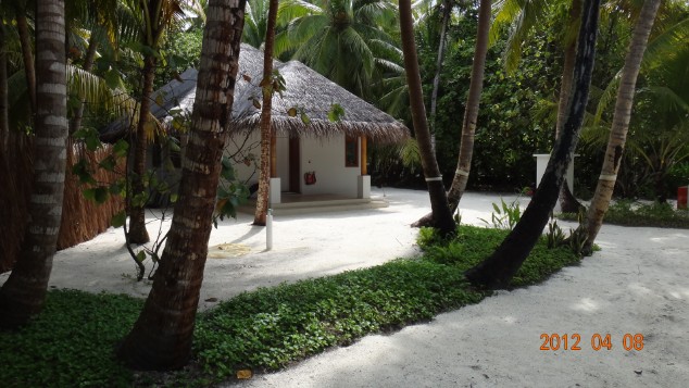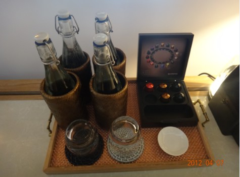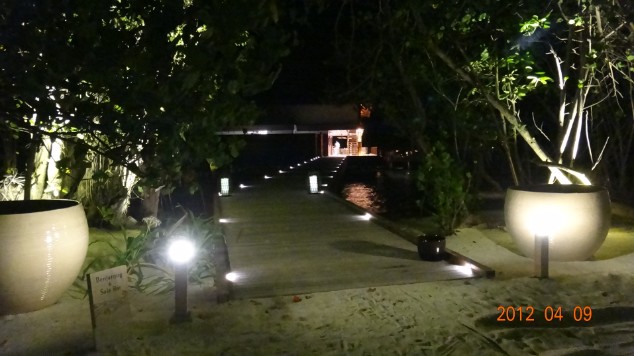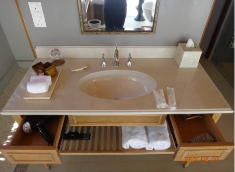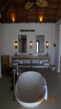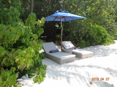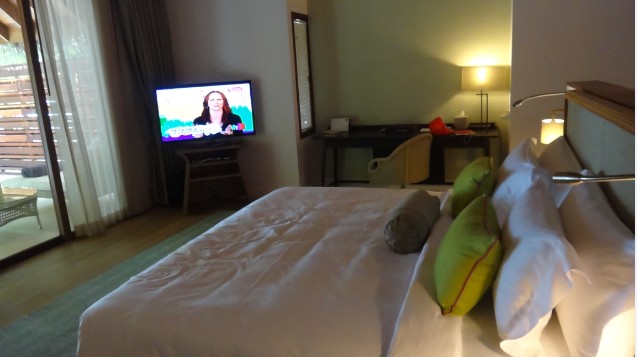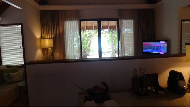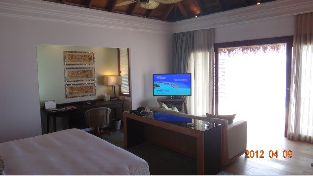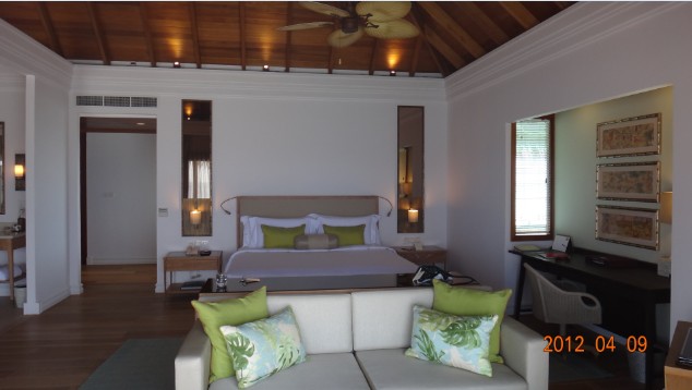第一天住的沙滩别墅,房间挺不错的,床对面的玻璃门走出去几步就是海滩,躺在床上可以透过去看海。可能是第一天吧,房间里赠送了水果,冰柜里送了2瓶柠檬汁(有点姜味),还送了一盒小甜点。房间里应有竟有,转换插头(有三组插孔)、牙刷牙膏这些都不用带。当时房间里人字拖,打了个电话就有人送来了两双,房门口有雨伞。房里每天会供应八瓶水,上午四瓶、晚上四瓶,会在housekeeping时补充,都是大瓶,完全够喝了。房间里有博世音响,可接各种音乐设备(包括连接ipone和ipad的插头),听歌看电影的声效一级棒!房间都覆盖了免费的wifi,没有密码,别看信号只有一两格,那网速还是相当快的。可惜是国外的网络,ipad里什么QQ音乐、迅雷看看、pptv都因为版权限制播放不了。只能看离线。