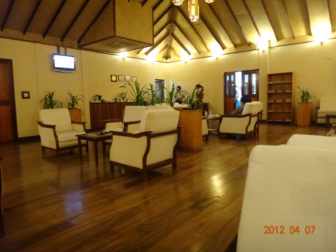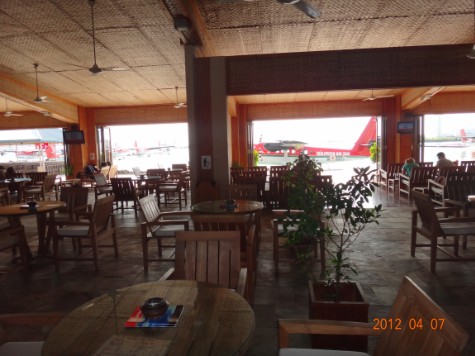 刚到马累机场我们就听说印尼发生海底地震了,美国已经发出海啸预警,可把我们吓的不轻。我四处打探,发现只有机场大楼稍微高一点,做好了随时往高处逃的准备。机场外有一个装修看起来还可以的餐厅,运气比较好,里面竟然还有空调包间,可能消费比没空调的高点吧。我和老婆下午就一直呆在那个餐厅里,包间内也有插座可以充电看IPAD,而且还有免费wifi!我们就一边上网不停的更新地震的最新小心,一边忐忑的看着《创世纪》,饿了就点了点薯条和炒面,味道还凑合,不是特别贵。我一个劲地给老婆喂肉,万一被海啸卷走了,多吃点肉就多一点热量,就能在海里多泡一会。。。。。。