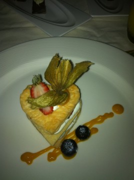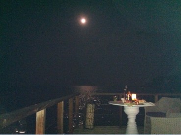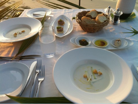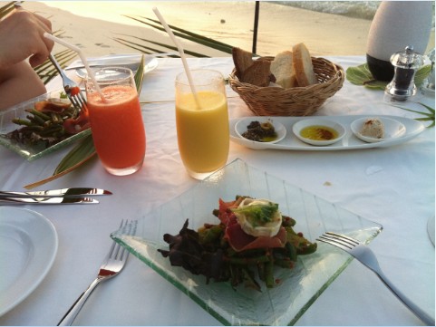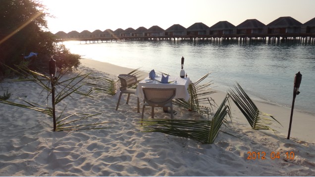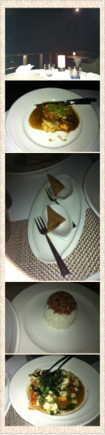 晚上18:30,期待已久的蜜月烛光晚餐!最主要的是省了我们一顿晚饭钱!!!虽然是赠送的,但品质一点也不忽悠哦!餐桌摆设是早都摆好了的,还有一个小黑专门服务,他还用叶子给我们扎了两只热带鱼!晚餐是一整套的:头汤、沙拉、前菜、主菜、甜点。这里要说下主菜,是煎鱼,比之前的蒸鱼好吃哪去了!而且鱼下面还有龙虾肉拌饭,真不忽悠啊!
