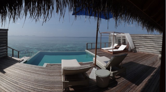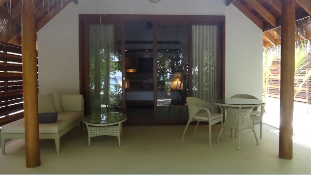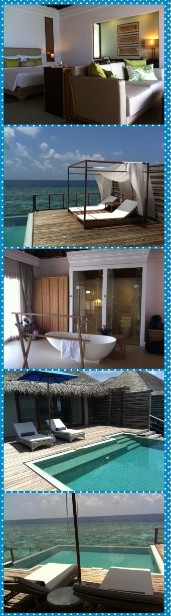 这里要特别提醒!预订水屋的时候请务必看清楚英文,岛上有OV和LV两种水屋,OV(Ocean villas with pools)是真正的水上别墅价格略高,LV( Lagoon villas with pools)是礁湖别墅价格略低是建在岸边礁石上的。我当时定的是2沙BV+2水OV,还好确认了一下,要不就被代理把我的OV调成LV了,所以童鞋们,网上的广告一定要看清楚哦!