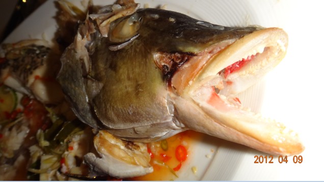 这条鱼是这家泰国餐厅唯一的败笔!我怀疑泰国做蒸鱼都会把鱼蒸的很老,味道不错可鱼肉的口感很差,肉很老咬不烂。而且也不知道吃的是啥鱼,把嘴巴一搬开竟是这般模样。。。像不像被核辐射过!?对不起~倒大家胃口了。。。我也想吐了。。。恶~~~