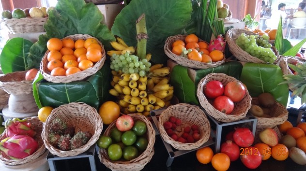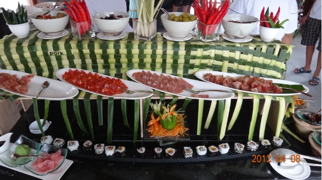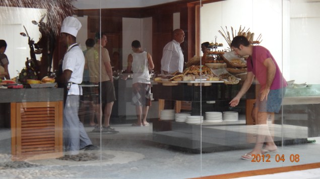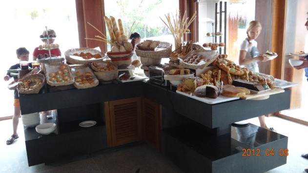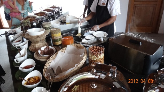 9:00钟我们来到markting吃免费的自助早餐,原来在普吉岛吃过希尔顿的自助早餐,以为已经很不错了,没想到这里的更上一个档次!鲜榨的果汁、大壶的红茶、特色咖喱、厚厚的生鱼片、现切的水果、严肃的厨师长。。。。。。童鞋们使劲吃啊!!!早饭加午饭啊!!!一顿饭管到晚上啊!!!上图!