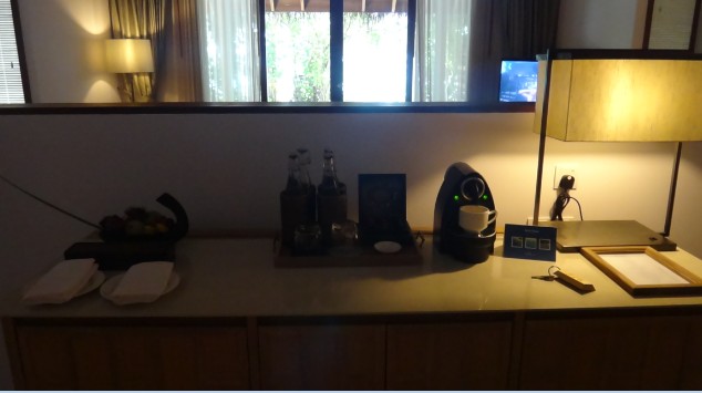 桌上从左到右依次是:赠送果盘+甜点、饮用水、咖啡包、咖啡机、台灯、房间钥匙、价目表。