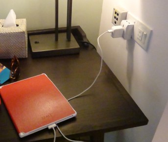 桌子,看到酒店配的转换插头吗,上面也是有插孔的。